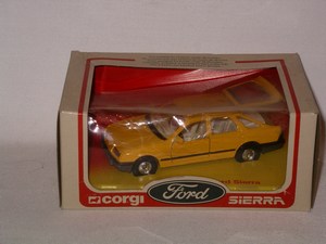 CORGI Ford Sierra 2.3 Ghia. Yellow. Great logo’s for FORD and Ghia on box. 1982, unopened but cellophane needs re-sticking and some wear to box.