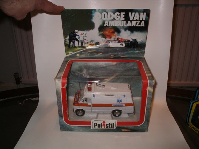 Politoys Dodge Van Ambulance from racing circuit. Old shop stock but some wear to box. 1:25 scale.