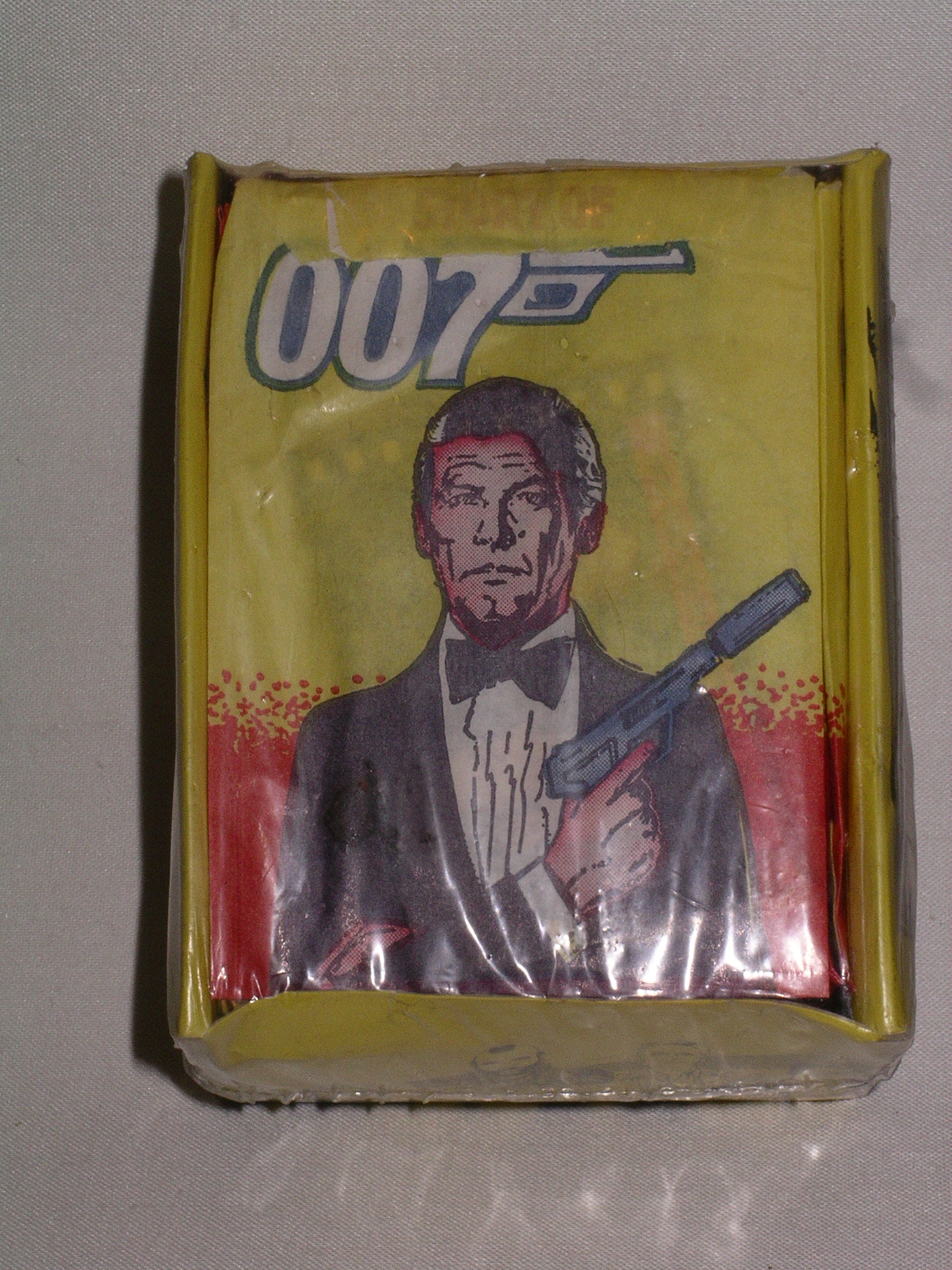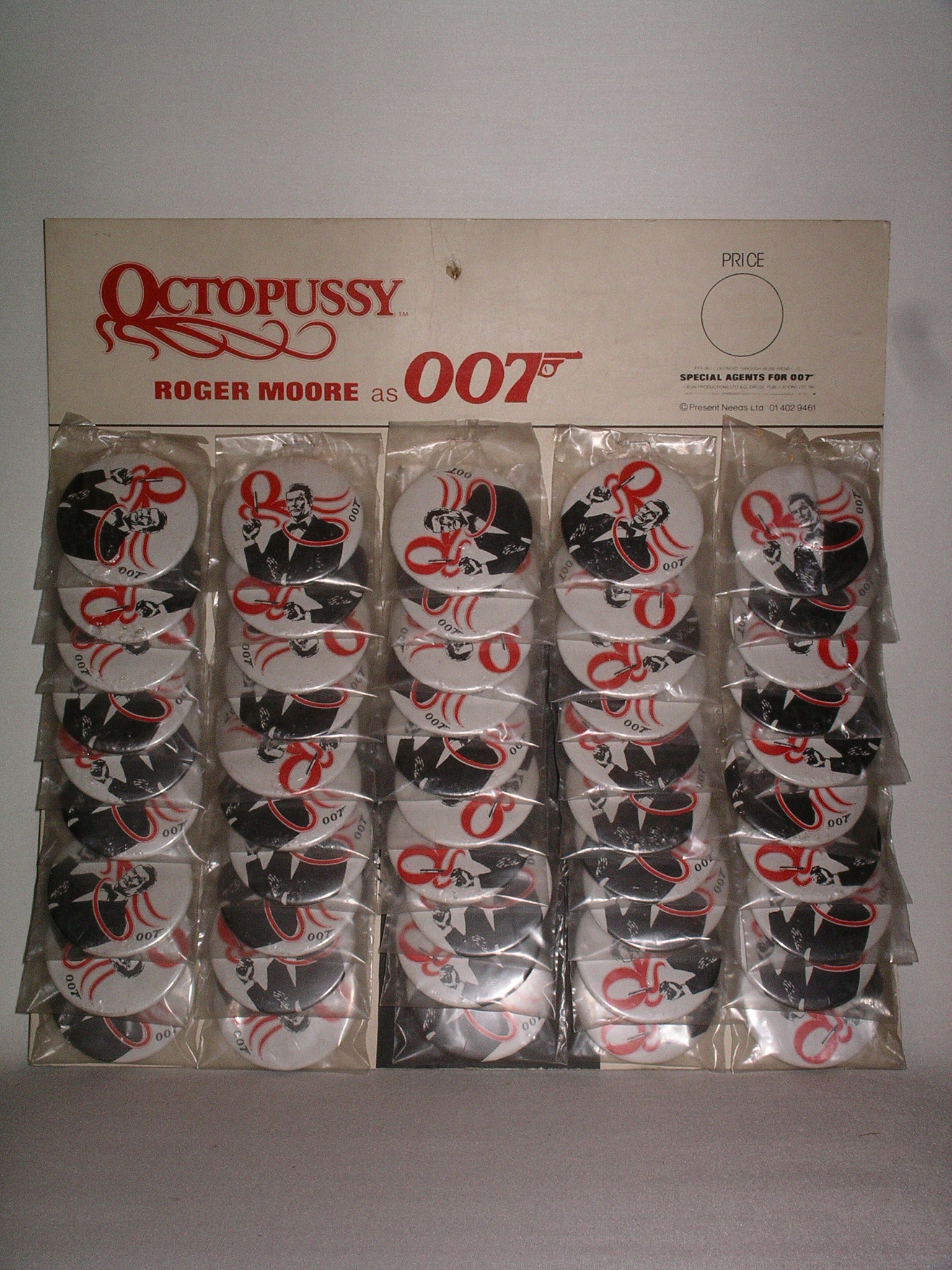 James Bond Octopussy badges on shop display. 50 badges on the card, so £1 a badge!