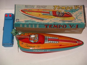 Japanese tin plate speedboat Tempo. 1960’s. 9 inches long. Old shop stock and near mint.