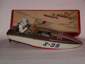 Japanese tin plate speedboat S35 from 1960’s. 10 inches long. With top of box but no base to box.