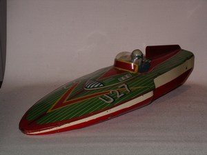 Japanese tin plate speedboat U27 from 1960’s. Large 13 inch boat.