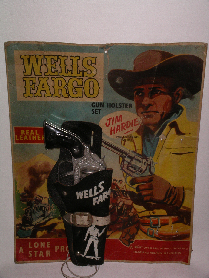 Lone Star Wells Fargo. The Tales of Wells Fargo. From the NBC (USA) TV show that ran from 1957 to 1962. http://tviv.org/Tales_of_Wells_Fargo. Rare UK produced toy. Gun has fatigue, see pictures and is marked ‘Cisco Kid’. Card is worn, condition 5/10.